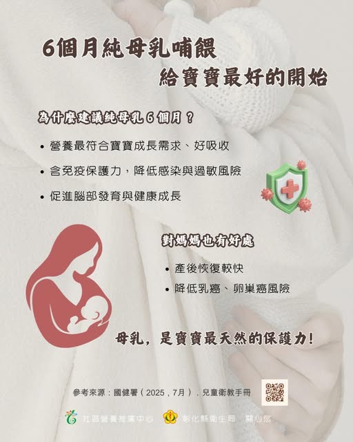 ::: 首頁 › 訊息專區 › 最新消息 最新消息 【健康宣導】6個月純母乳哺餵,給寶寶最好的開始 2026-04-13 【6個月純母乳哺餵,給寶寶最好的開始】 母乳是寶寶最天然的營養來源,能幫助提升免疫力,降低感染與過敏風險,並支持健康成長與發育。 建議寶寶出生後純母乳哺餵 6 個月,之後搭配副食品,持續哺餵至 2 歲以上。 每個家庭狀況不同,在可行範圍內持續哺餵,給寶寶最好的照顧 回列表